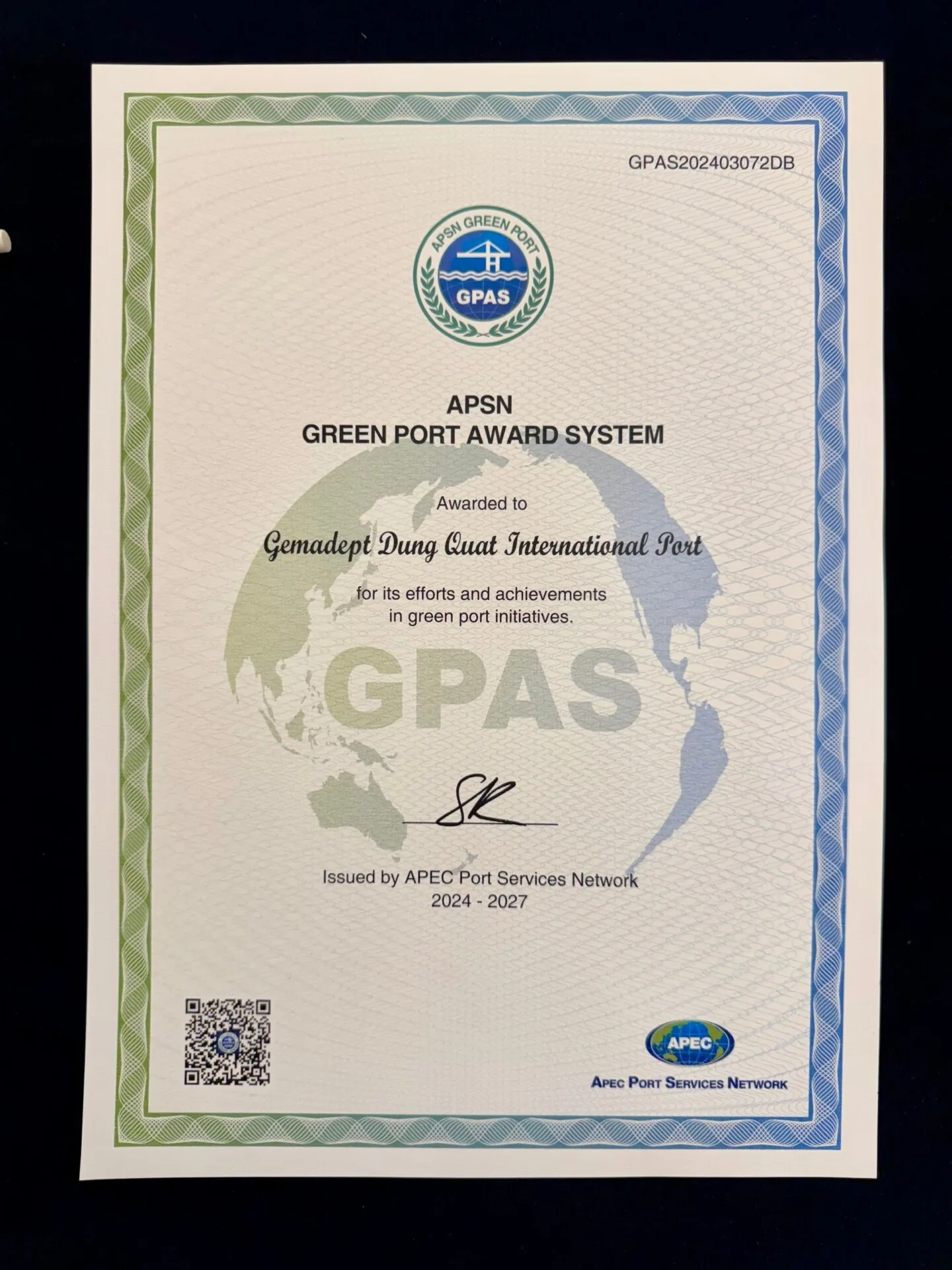 After evaluating activities over the past three years, the representative of the APEC Port Services Network (APSN) awarded the GPAS 2024 to Gemadept Dung Quat Port. Along with it, 11 other representatives also received the award, including major names on the global maritime map such as Shandong Port Group Yantai Port West Port Area, Nansha Port Phase IV Fully Automated Terminal, Xiamen Ocean Gate Container Terminal, Bangkok Port, Johor Port, and more.
